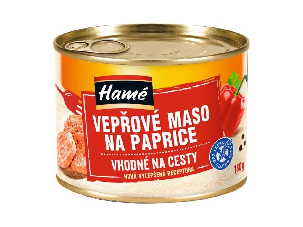 Bravčové mäso na paprike. Mäsová konzerva. Termosterilizované.