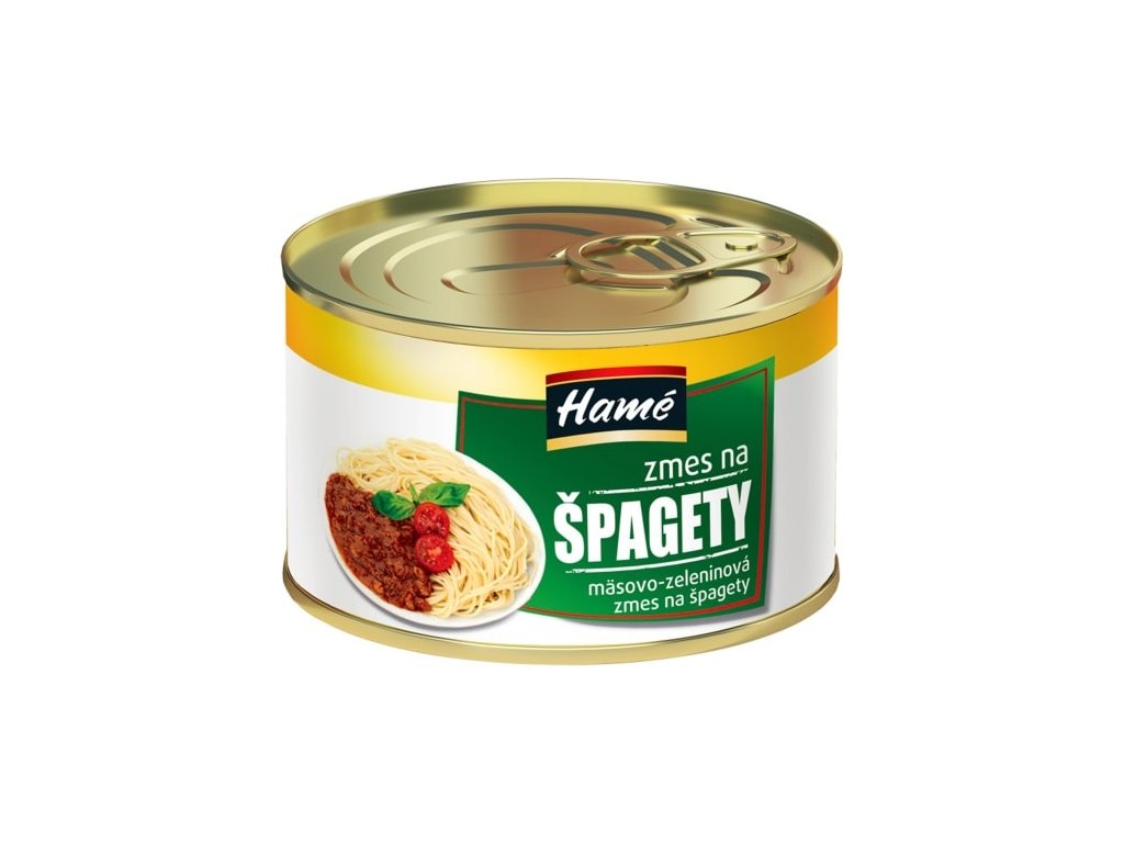 Mäsovo-zeleninová zmes na špagety. Sterilizované hotové jedlo, mäsová konzerva.