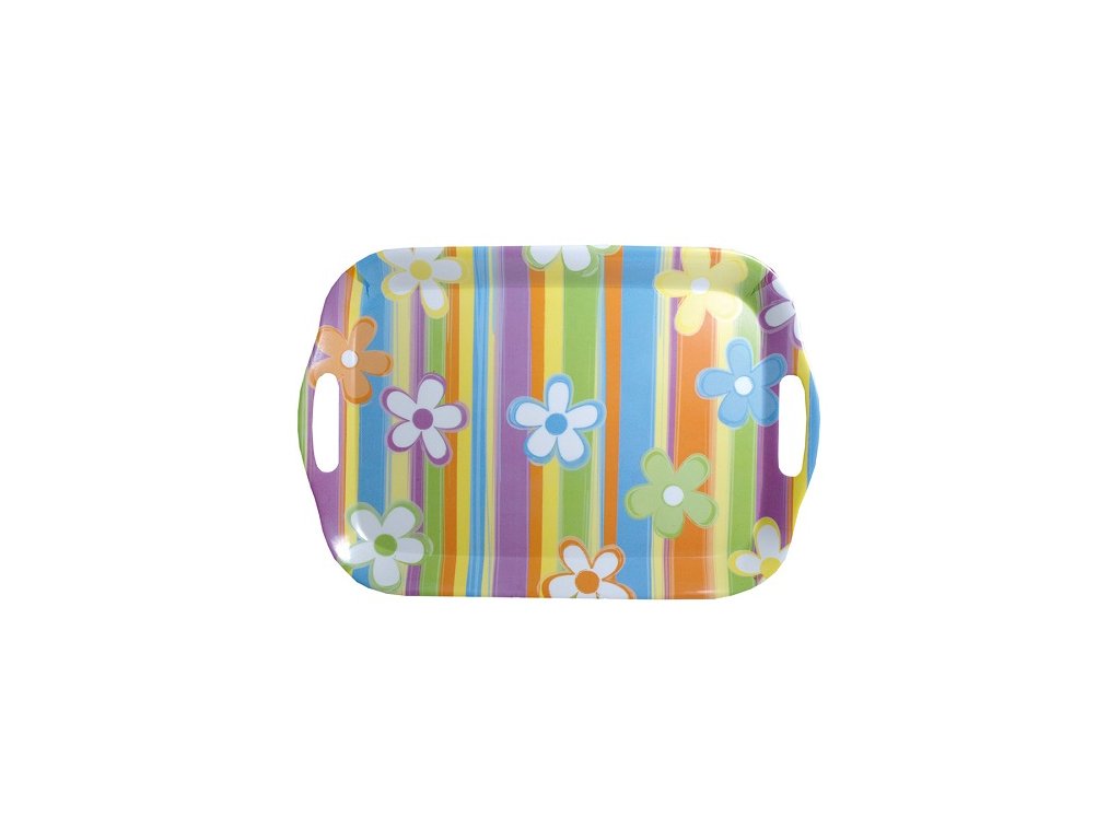 Plastový podnos s farebnými vzormi. Možno čistiť pomocou tekutého čistiaceho prostriedku na riad, ktorý sa nepoškriabe.